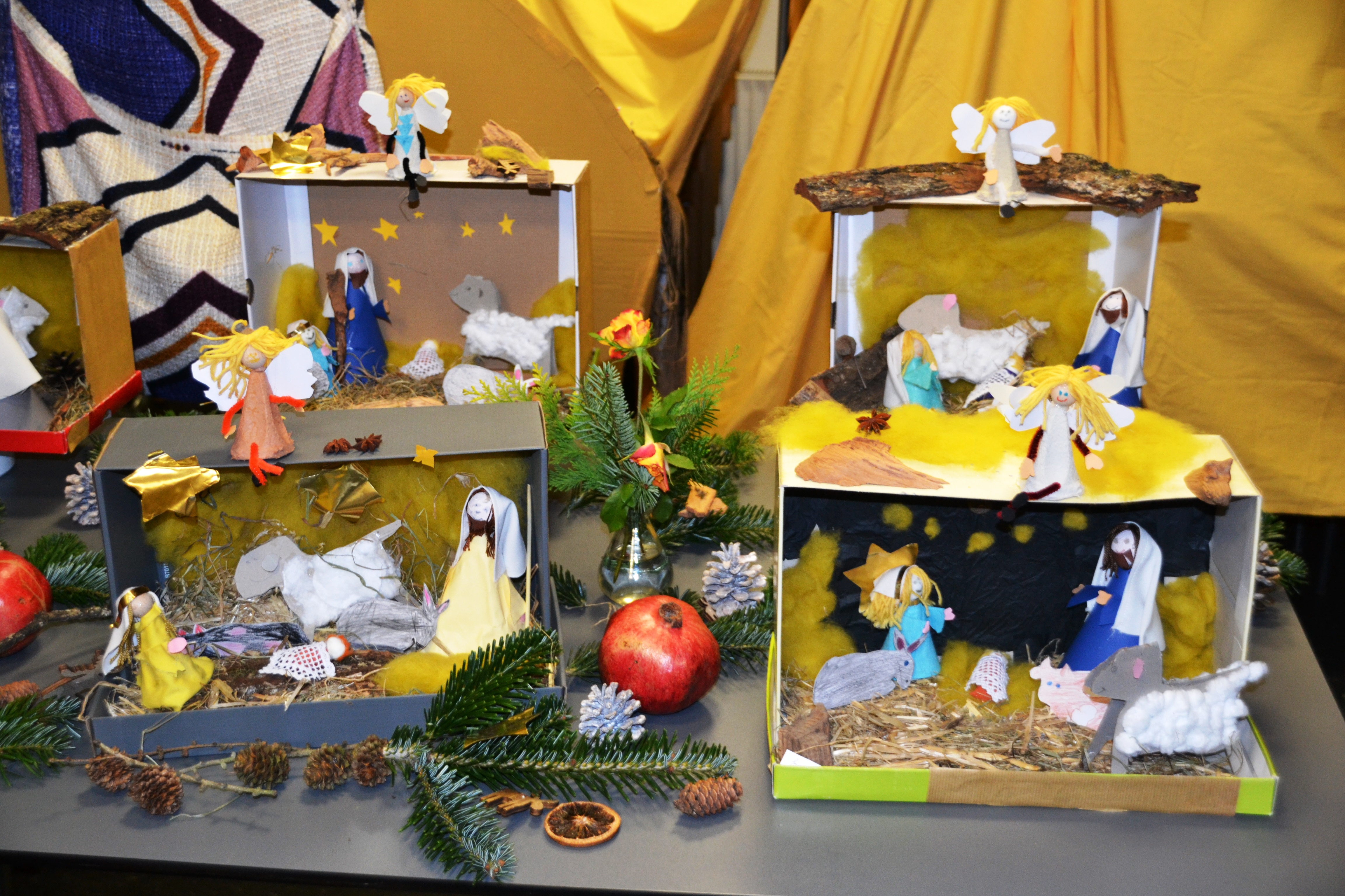 Wir kamen auf die Idee, Krippen zu basteln. Ana-Maria della Portilla fertigte als Anschauungsstück eine Krippe im Schuhkarton. Alle dazu benötigten Materialien waren aus Naturprodukten: für die Engel wurden Teile von Eierkartons verwendet. Aus Papptellern entstanden die Körper von Maria und Josef. Jedes Kind hat seine eigenen Ideen eingebracht.